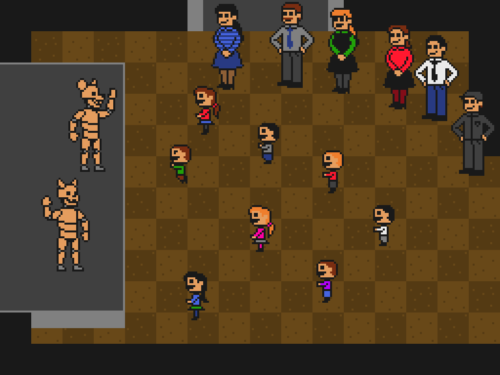 Beginning in an unclear part of the map, perhaps not even in the same building as the other minigames, the player controls a young girl in a black dress and bright green sleeves and pantlegs. A banner saying "Grand Reopening" is on the wall behind them. The only possible path to take is left into a large stage room with the stage on the left side, where a crowd of happy children watches Withered Rat and Withered Cat in non-withered condition on the stage while their parents stand off to the side and vintage music is heard in the background. Upon entering the room, the scene progresses in total automation and the player is unable to move. A young boy (with may be her brother) wearing a shirt of the same bright green as the girl and a woman ( may be their mother) in the crowd excitedly runs up to the edge of the stage, the music gradually slowing into an eerie warped version of itself and fading. RAT slowly bends down and reaches out towards the boy, every face in the crowd turning from happy to surprised or scared in a single frame. The minigame ends.
