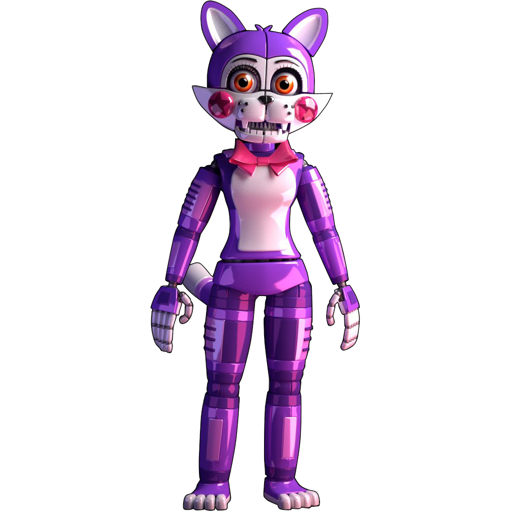 She is depicted as a cat-like funtime animatronic featuring a white face, chest and stomach area, white fingers, toes and a white tail-tip as well as the insides of her ears being white. The rest of her body features a purplish/pink coloration, with her eyes being orange and her cheeks being red.