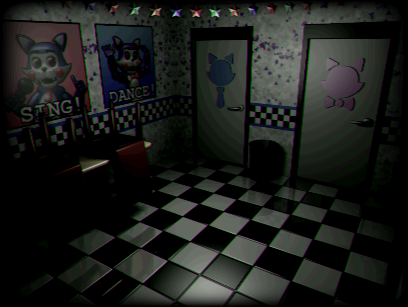 In the corner of the camera, there are chairs stacked on top of tables, signifying that it's night. The doors to the restrooms are on this camera. Candy's face is on the door to the men's restroom and the one with Cindy on it is the women's restroom. Candy's face is blue, while Cindy's face is pink. There's also two posters on the walls, one with Candy saying "sing" and one with Cindy saying "dance".