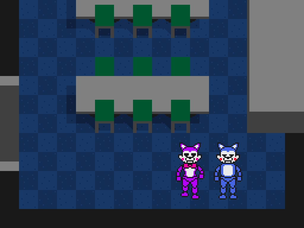 - New Cindy is seen at the intro of the FNaC2 trailer, in which it seems to be a commercial advertising Candy's Burgers and Fries. She is performing on stage with her brother, waving at children.