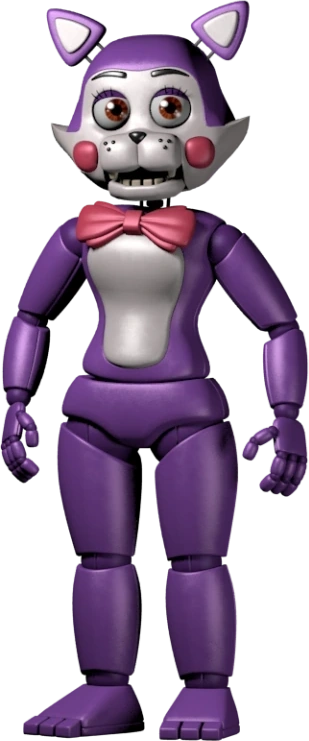 New Cindy is a purple cat animatronic with a white face and belly. She has brown-orange eyes and two pink cheeks. She wears a reddish pink bowtie. Overall she looks just like the original version, but with a few changes. Her joints don't appear to clip into her suit parts anymore. She has smoother feet as well. Her two previously-sharp teeth are no longer sharp.