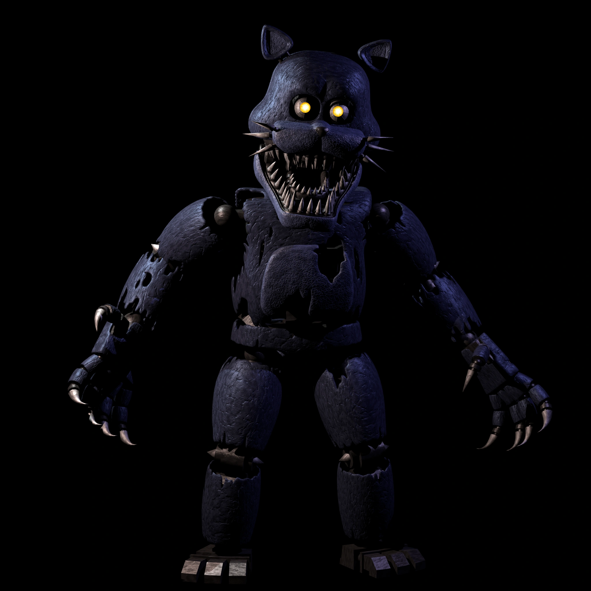 Large parts of his endoskeleton are exposed through tears in Nightmare Candy's body, especially through the upper torso and the lower legs. The endoskeleton appears to be somewhat similar to the ones from the first game (upon closer inspection), possibly revealing Springtrap and the nightmare animatronics were "made" around the same time as each other. Nightmare Candy's hands are exactly the same as Monster Cat's as well, albeit a different color to fit in with the cat color scheme.