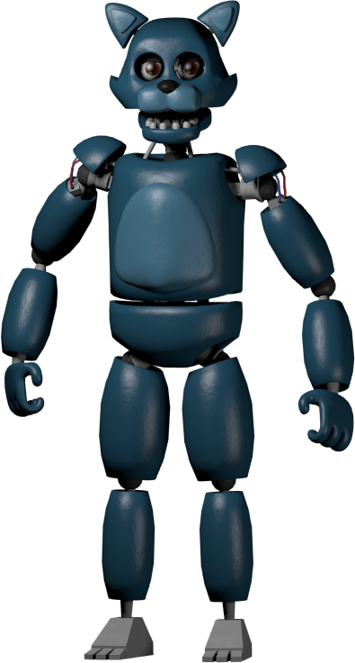 At first glance, he seems to lack eyes altogether. On closer inspection, he appears to have eyes, however they are completely dark. His pupils do not light up, making him the only other animatronic in the game besides The Rat whose eyes do not appear on the cameras without using night vision. This makes him hard to see when at the doorway as well.